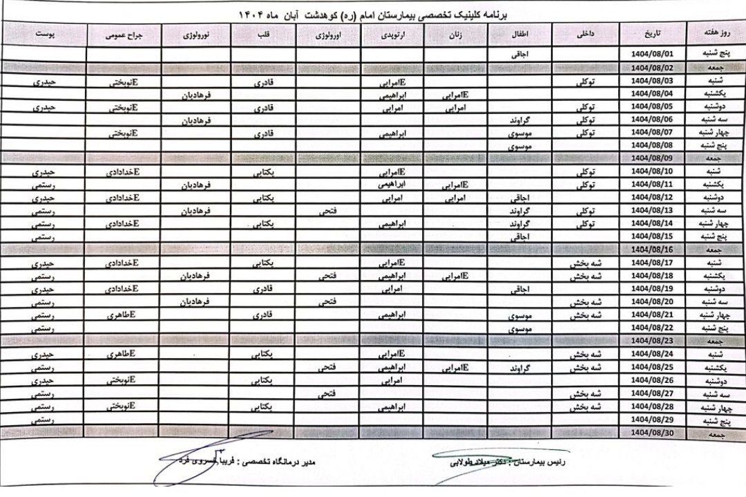 . ����برنامه پزشکان درمانگاه تخصصی بیمارستان امام خمینی(ره) کوهدشت، آبان_۱۴۰۴